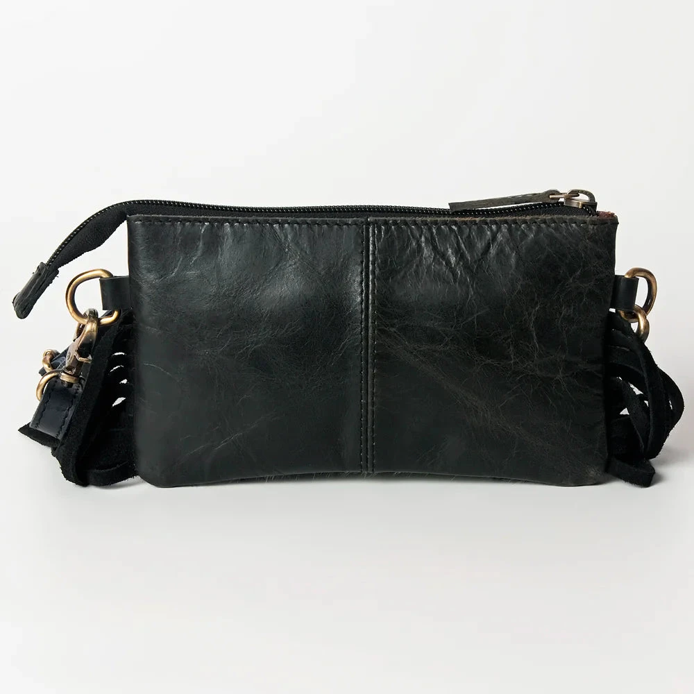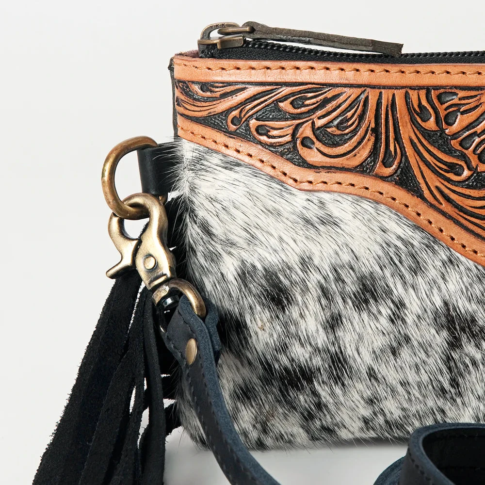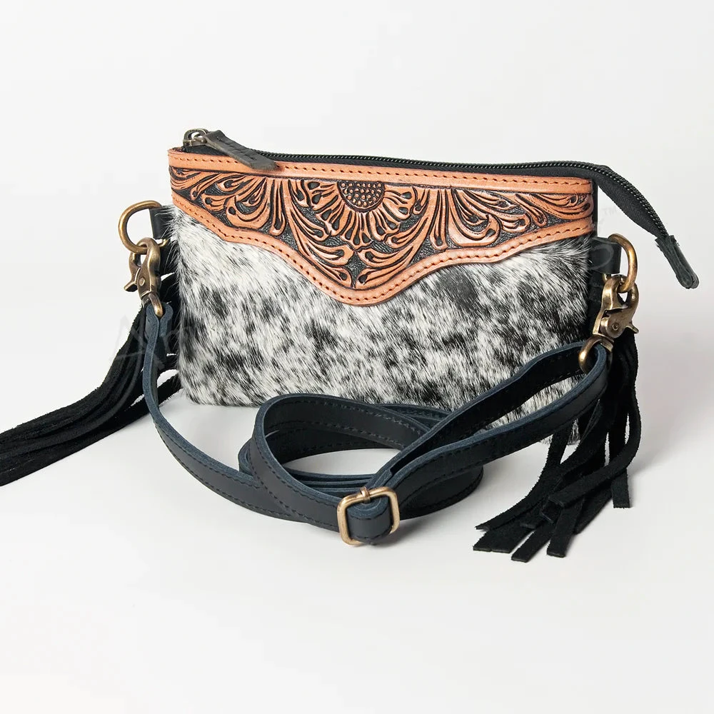 If you are looking for a black cowhide purse look no further! This one has so much character and style. The tooled leather top adds so much to this!!Â