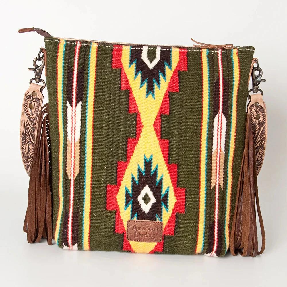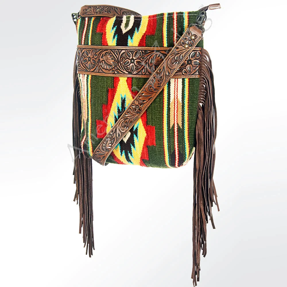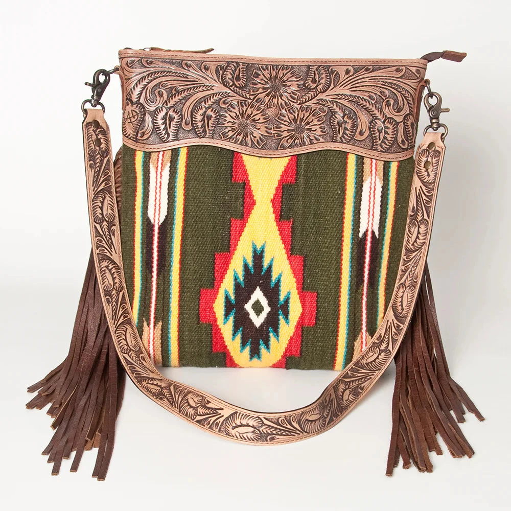 Just look at the beautiful green & yellow colors in this blanket and tooled leather bag. Perfect for any outfit you pair it up with.Â