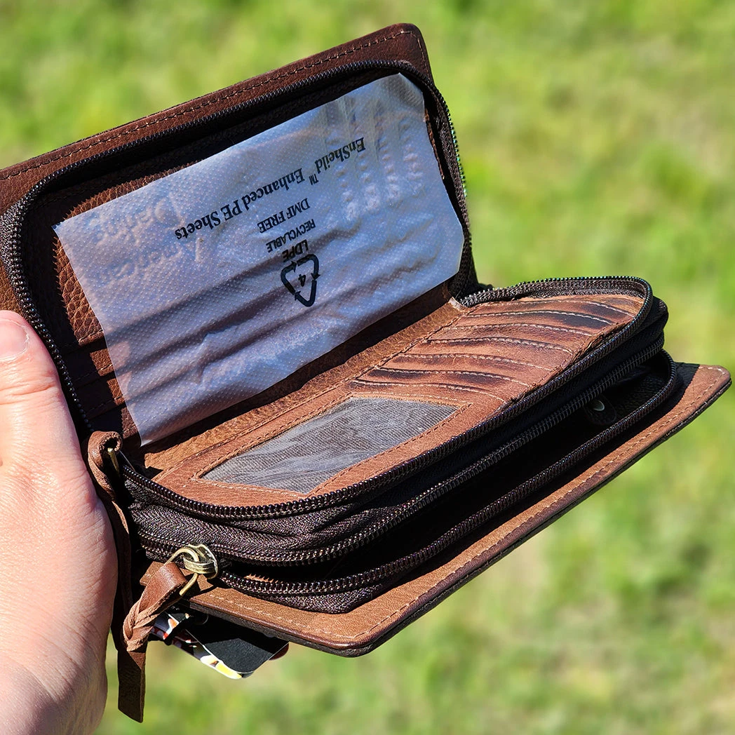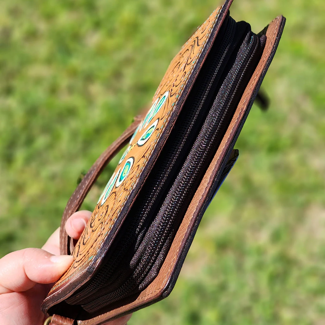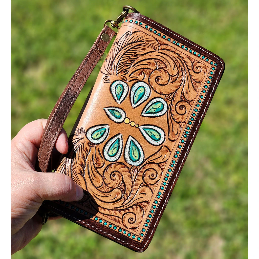 Just look at the fun detail in this wallet, we love the turquoise blossom on this fully tooled leather wallet. Features 2 Zip pockets, removable wristlet and plenty of room for cards and cash.Â