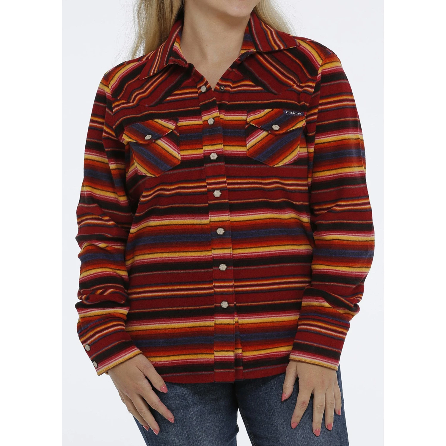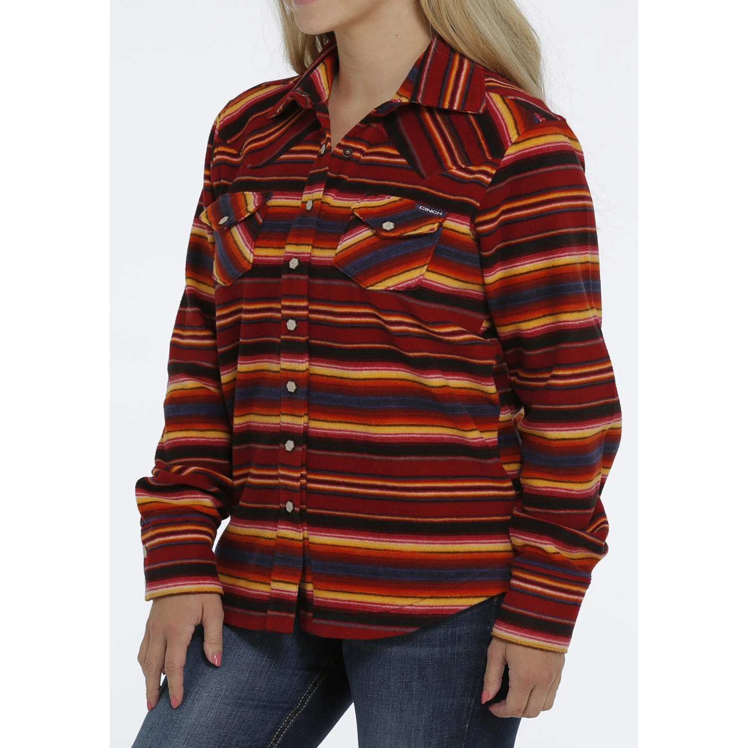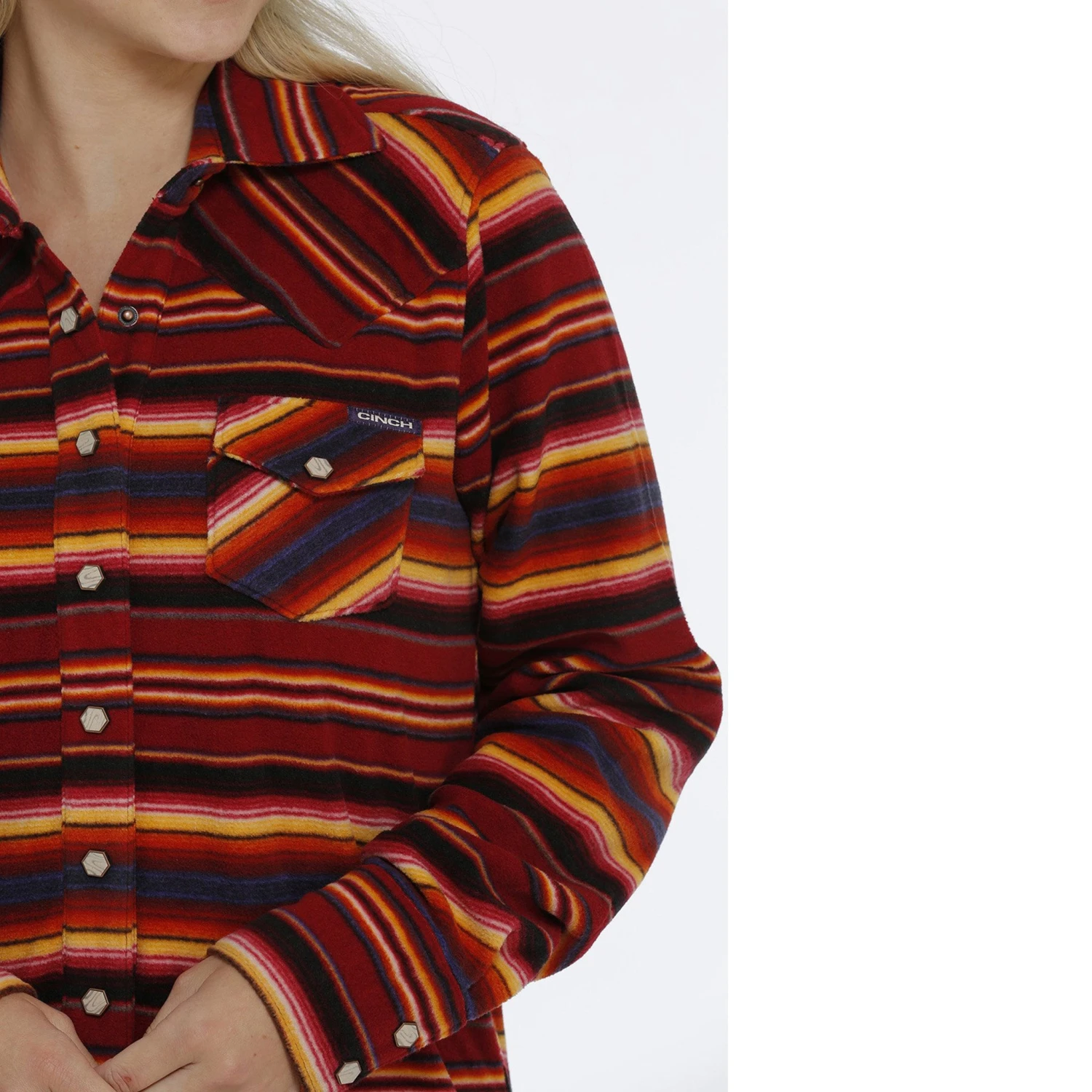 Show your bold side with this red polar fleece shirt jacket. This comfortable poly-spandex jacket features an eye-catching stripe print, double front pockets and Western yokes.