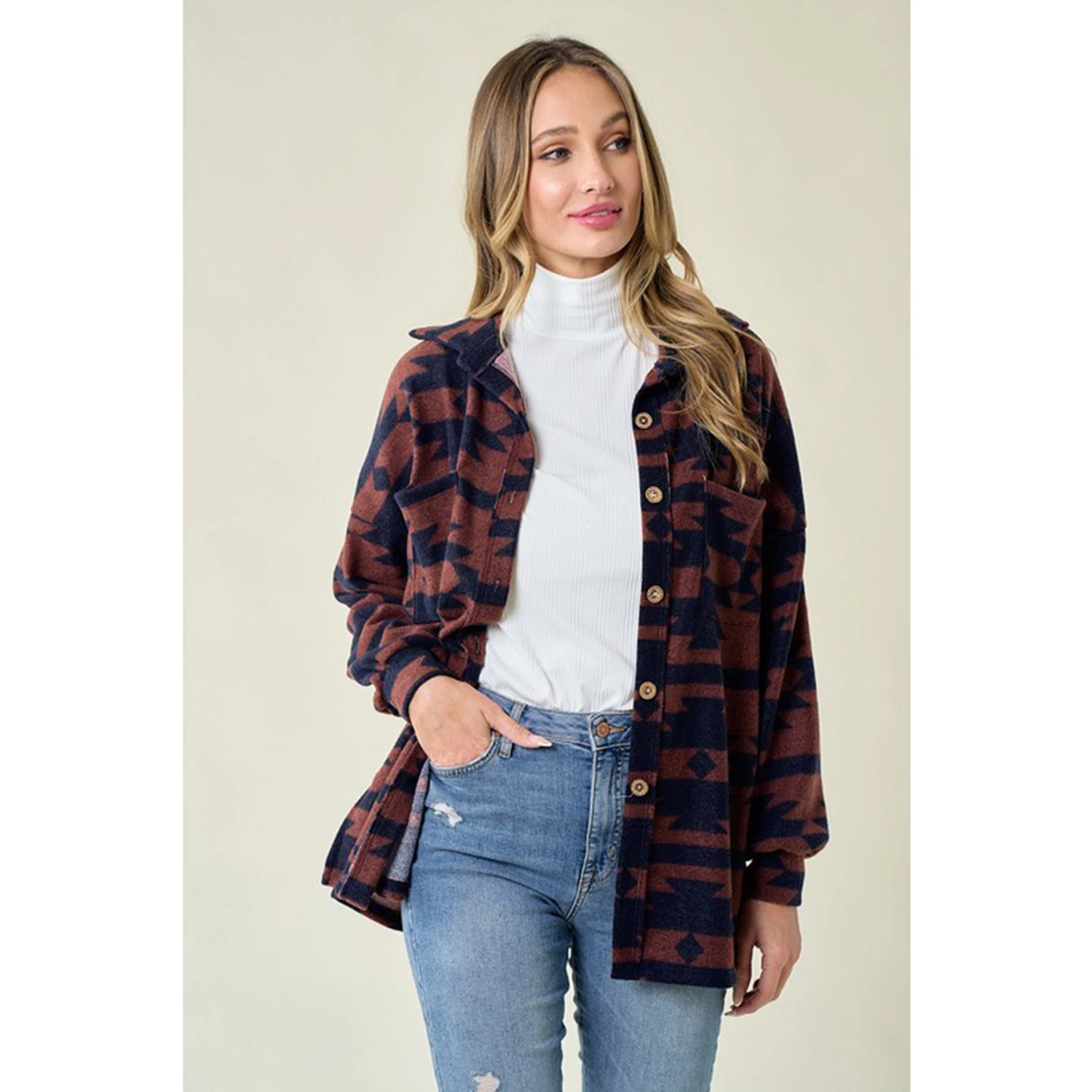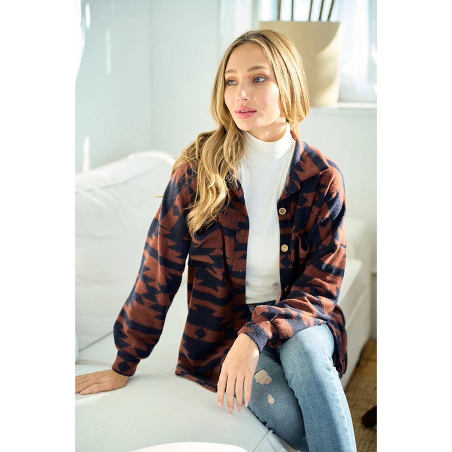 This aztec print suits perfectly to this oversized shirt jacket. Lightweight enough to wear it as a shirt.