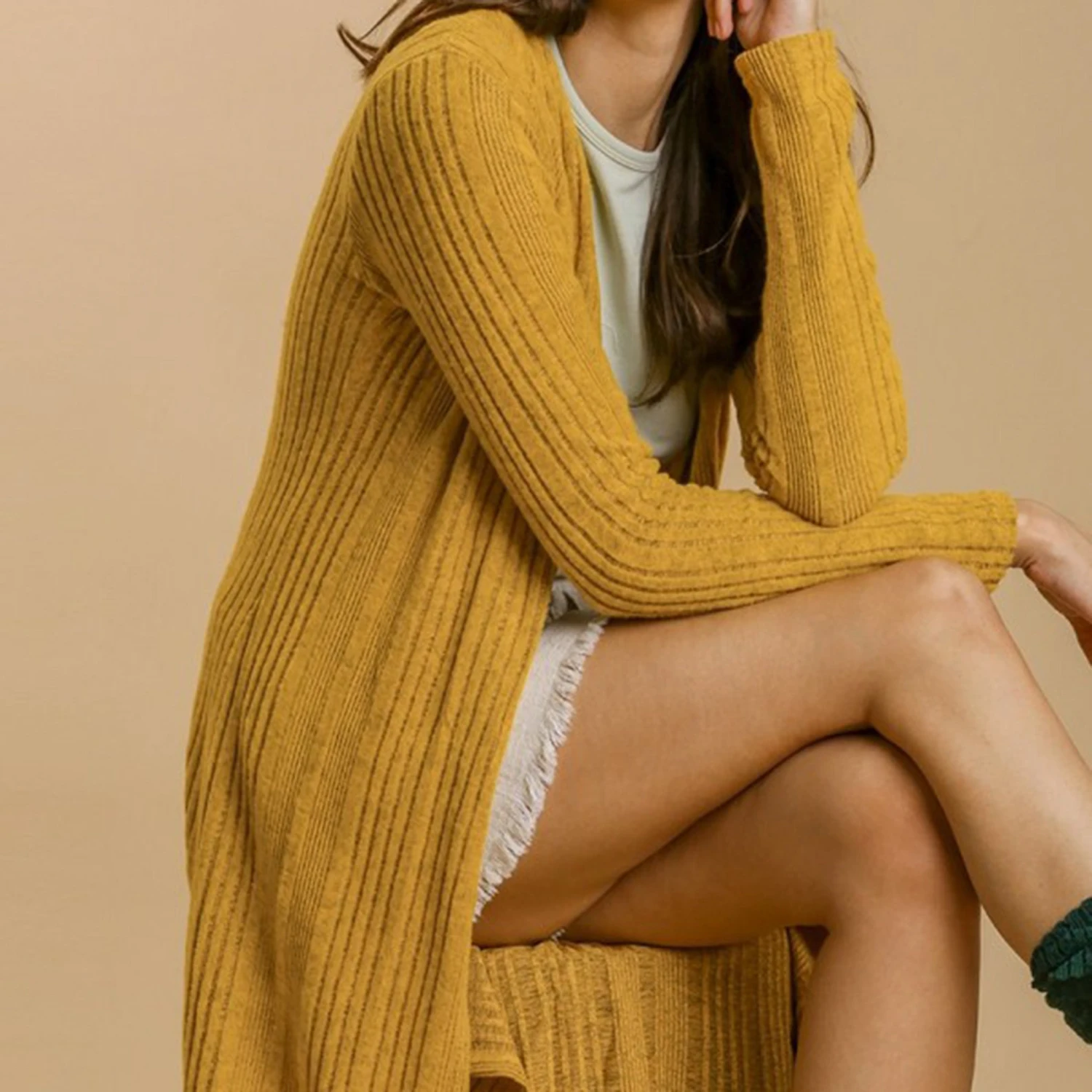 This cardigan is perfect for taking the chill off or for dressing up an outfit. It has a soft feel and has slits on both sides.