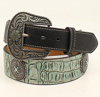 This belt features turquoise faux crocodile embossed leather with large round conchos.  This eye-catching belt would be a great addition to any pair of jeans. Â