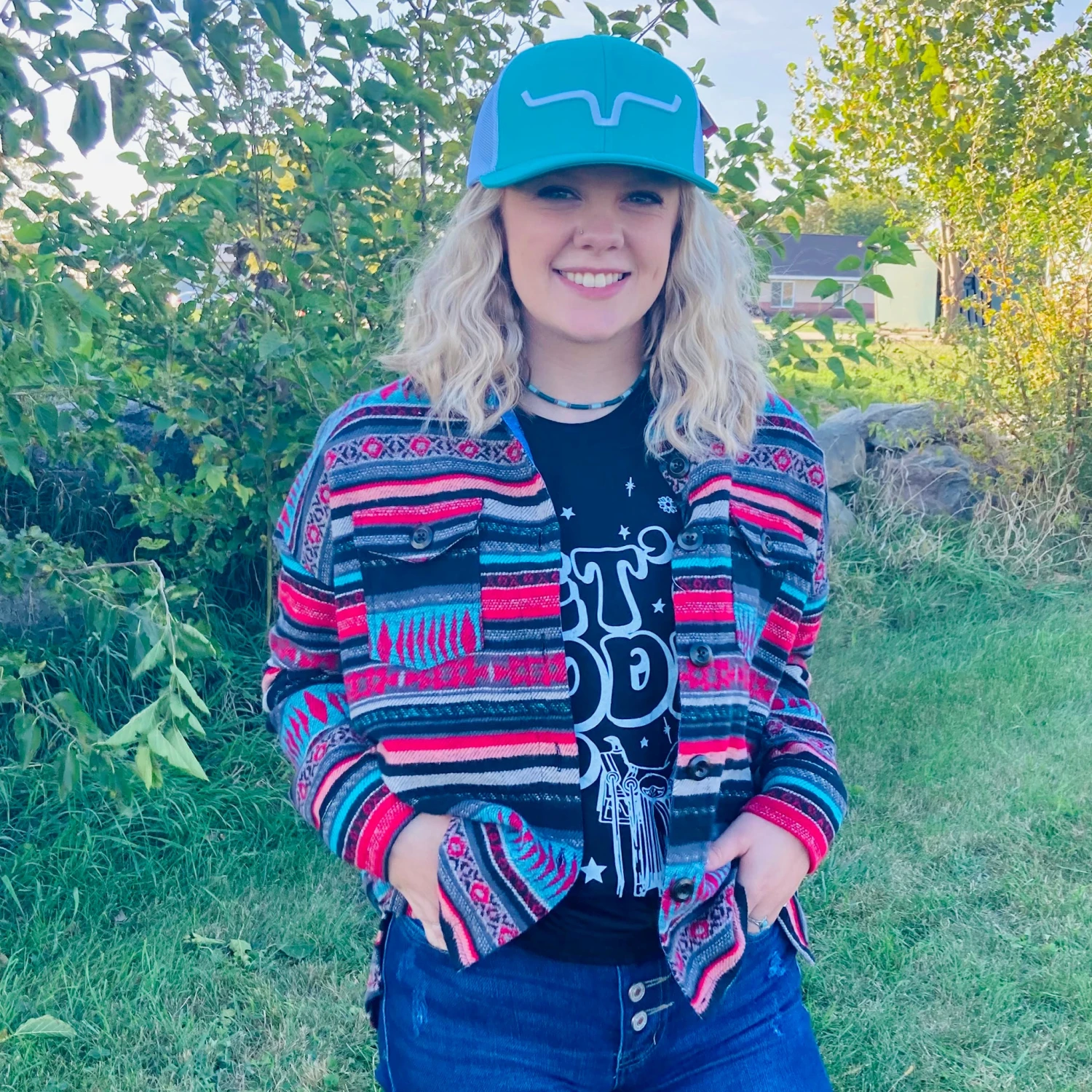 Panhandle Slim outdid themselves with this multi colored Aztec themed shacket! This shacket will pair great with your favorite graphic tee and booties for a night out with friends!Â