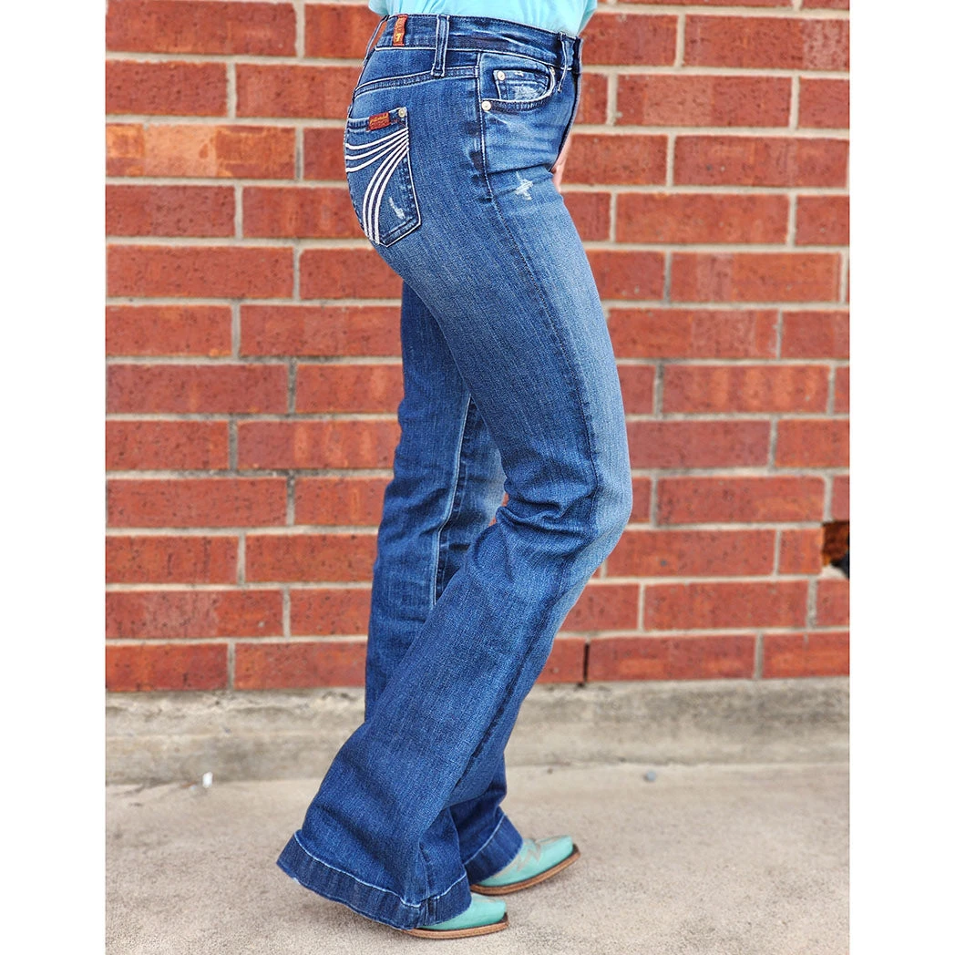 The original DOJO Trouser with a wide leg opening and embroidered 7 back pockets Whiskers, chevrons and hand sanding create a versatile and classic medium blue hue. Well-placed grinding creates a cool, vintage inspired style Complete with silver hardware, this fit is effortless and fabulous. These are sure to be your favorite jeans in yur closet you reach for for every occasion.Â